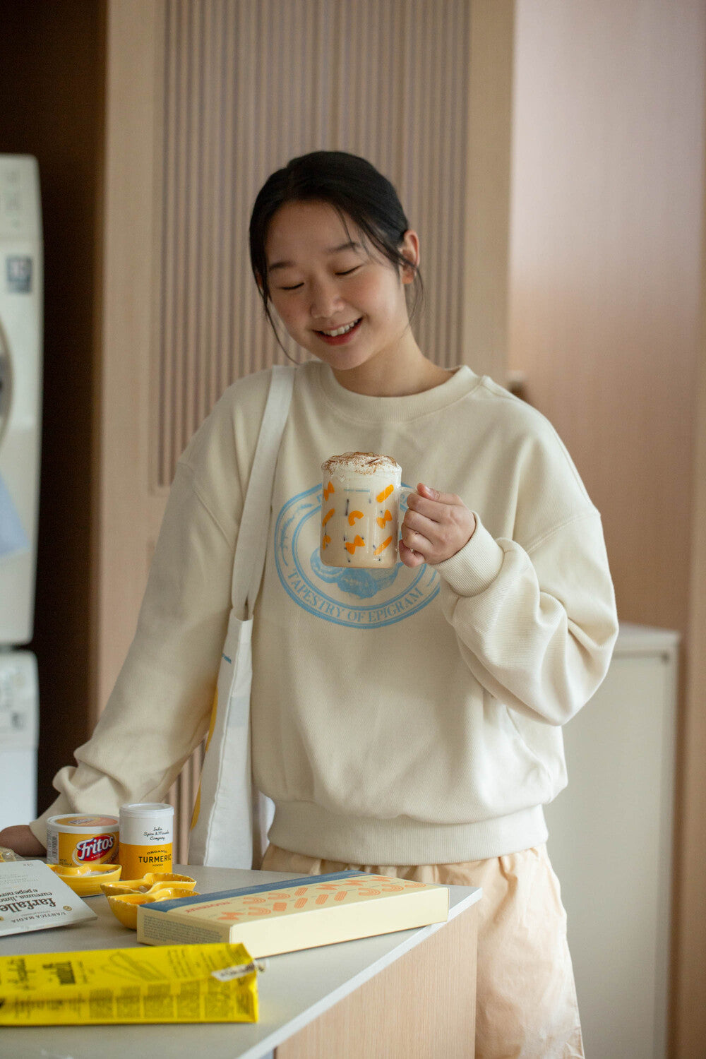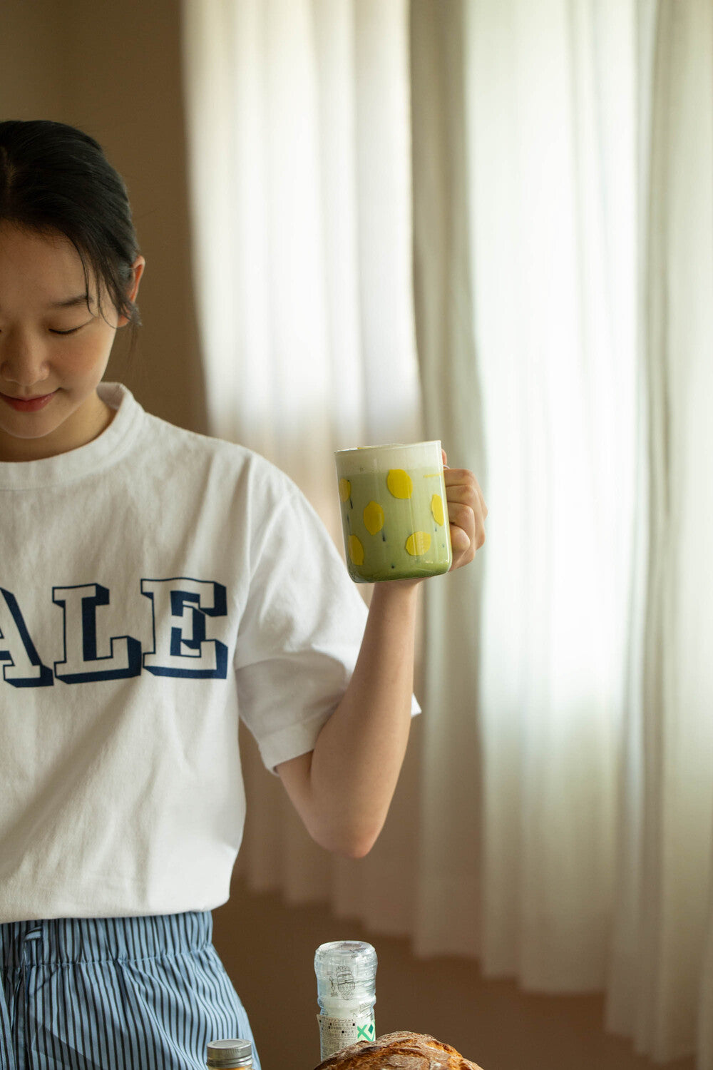 These are heat-resistant glass cups in the prints of macaroni, farfalle noodles and lemons