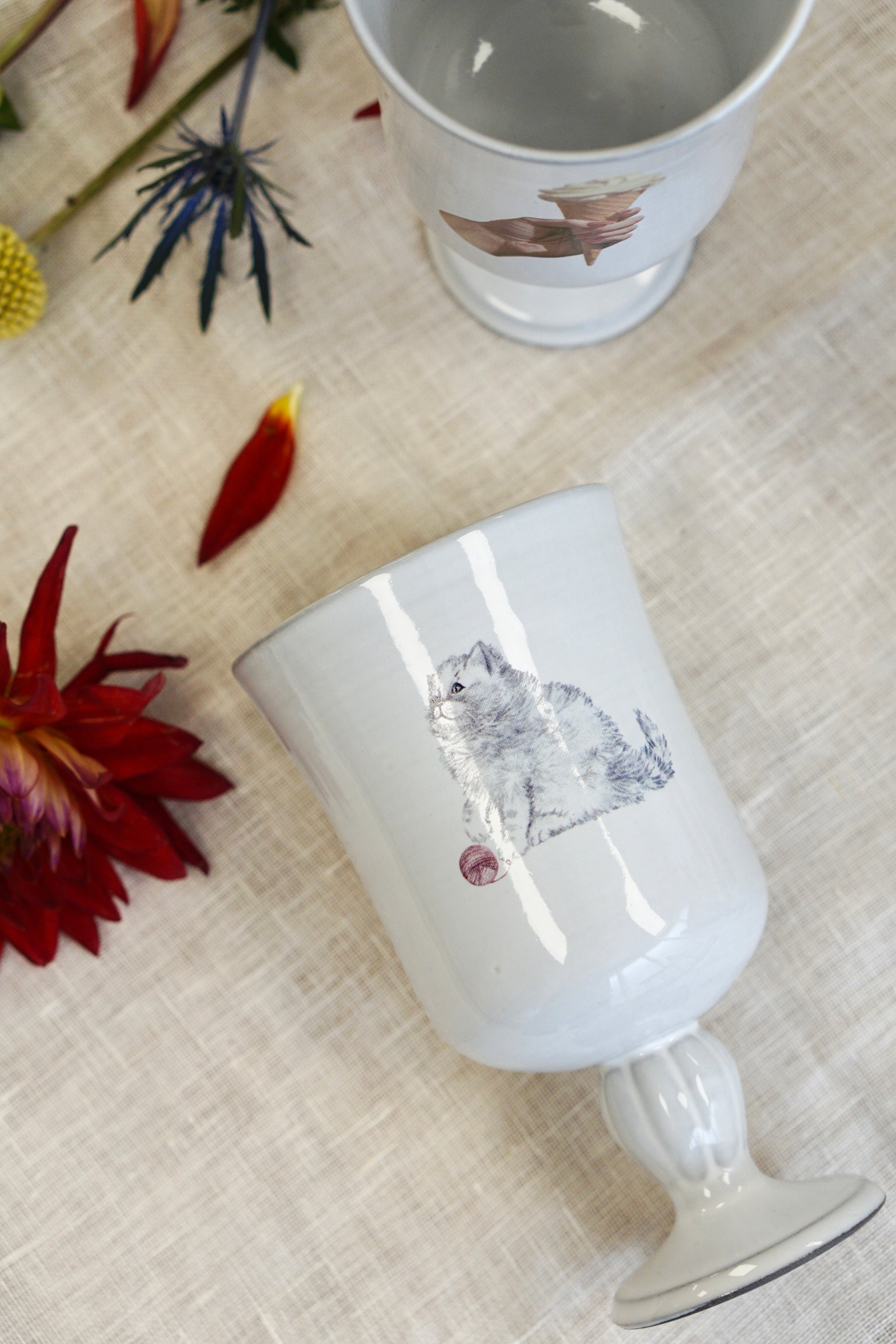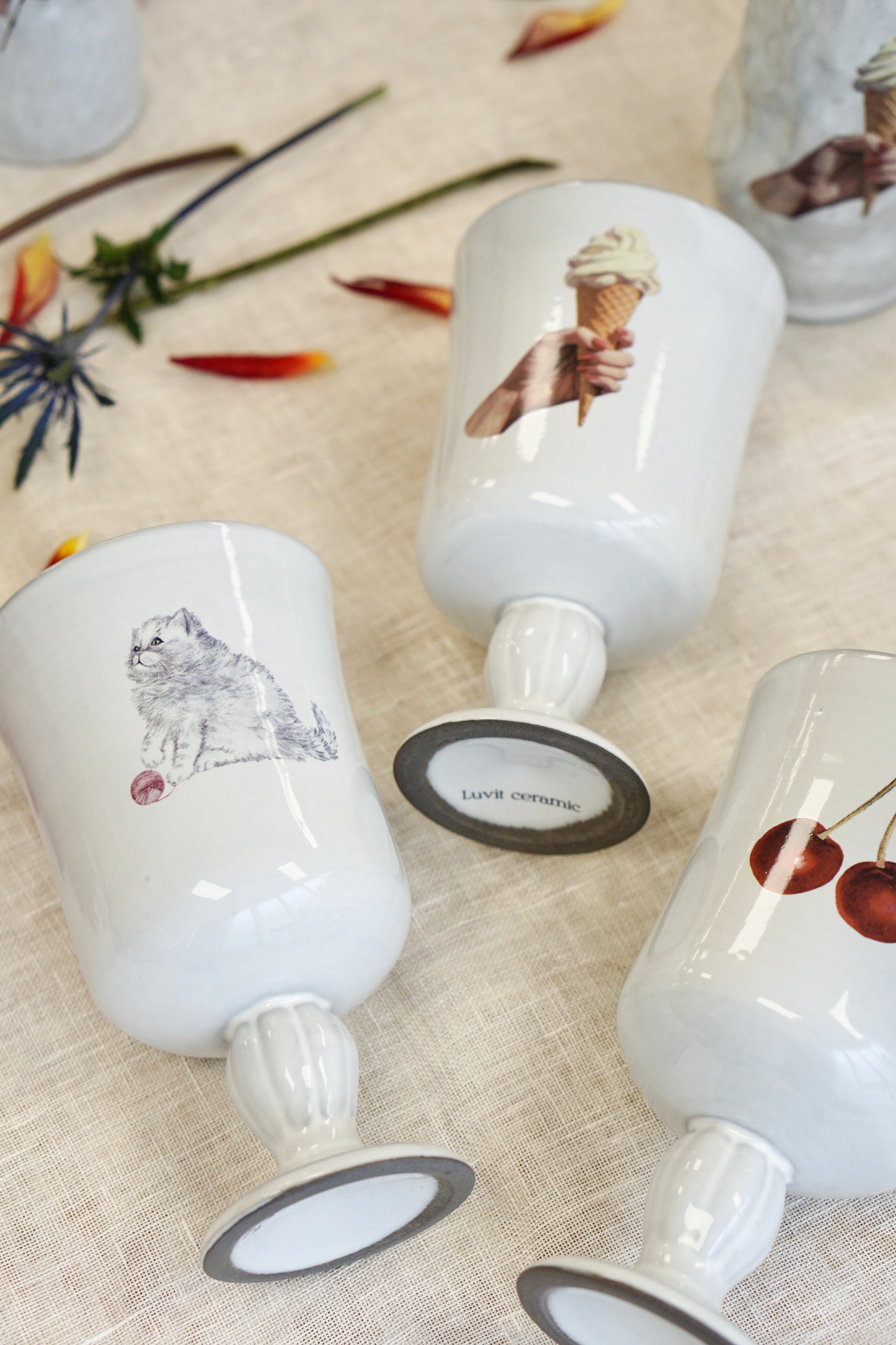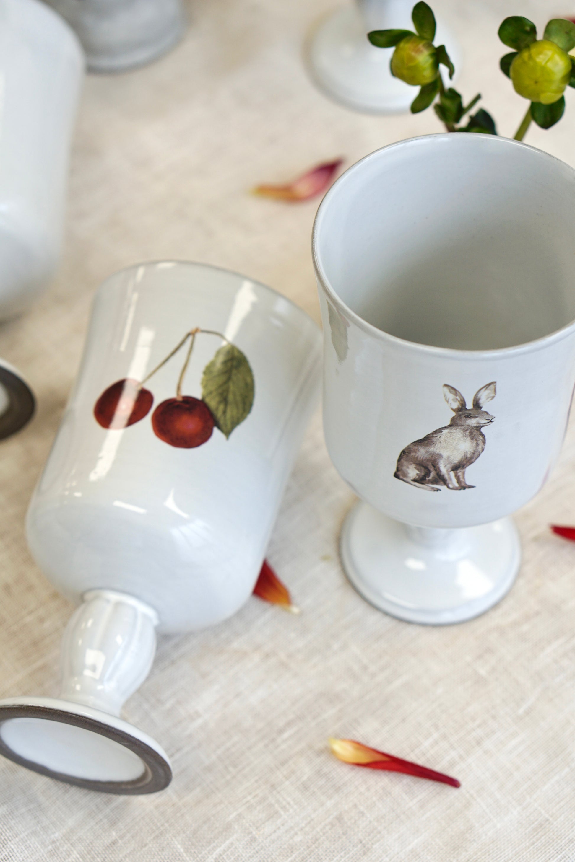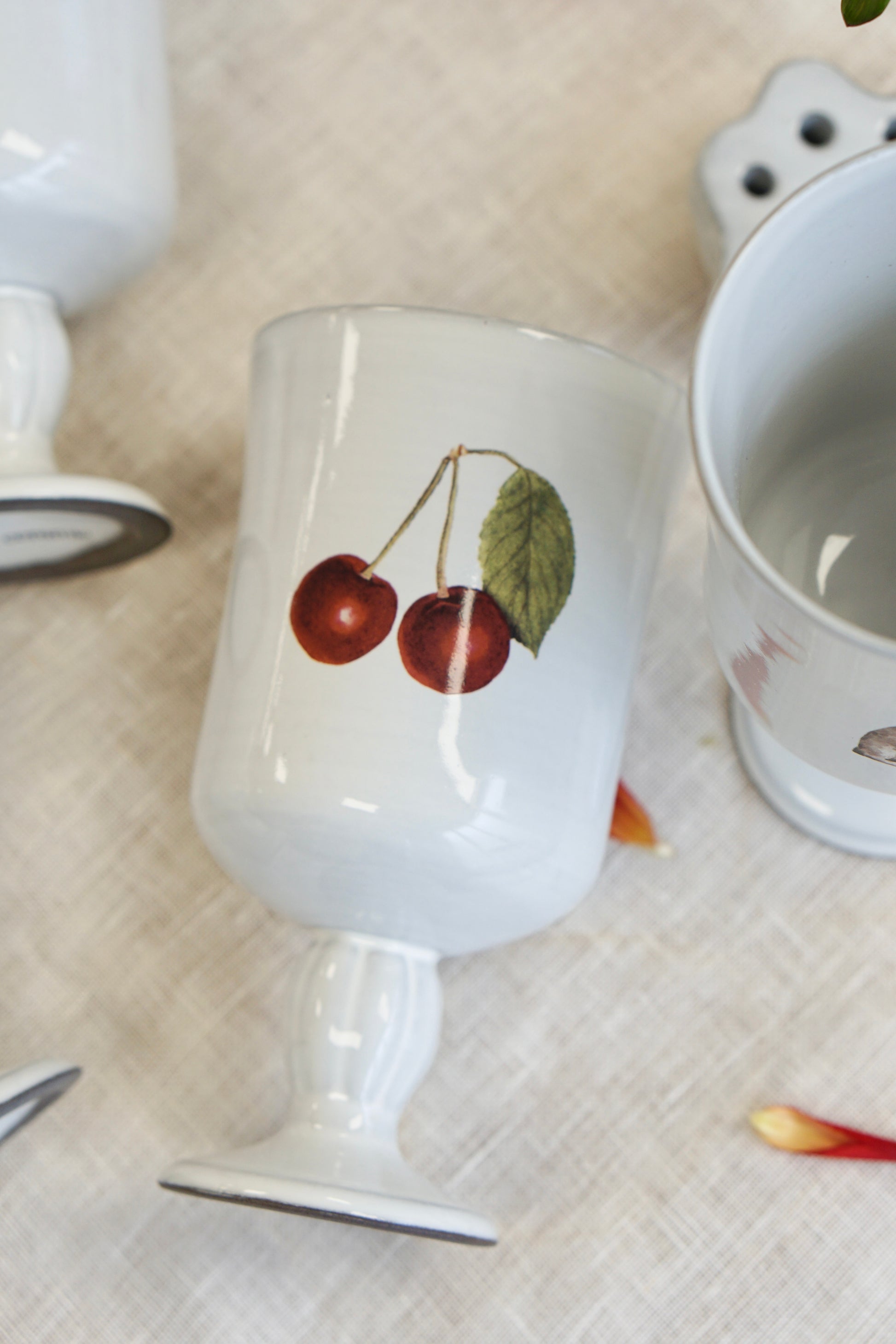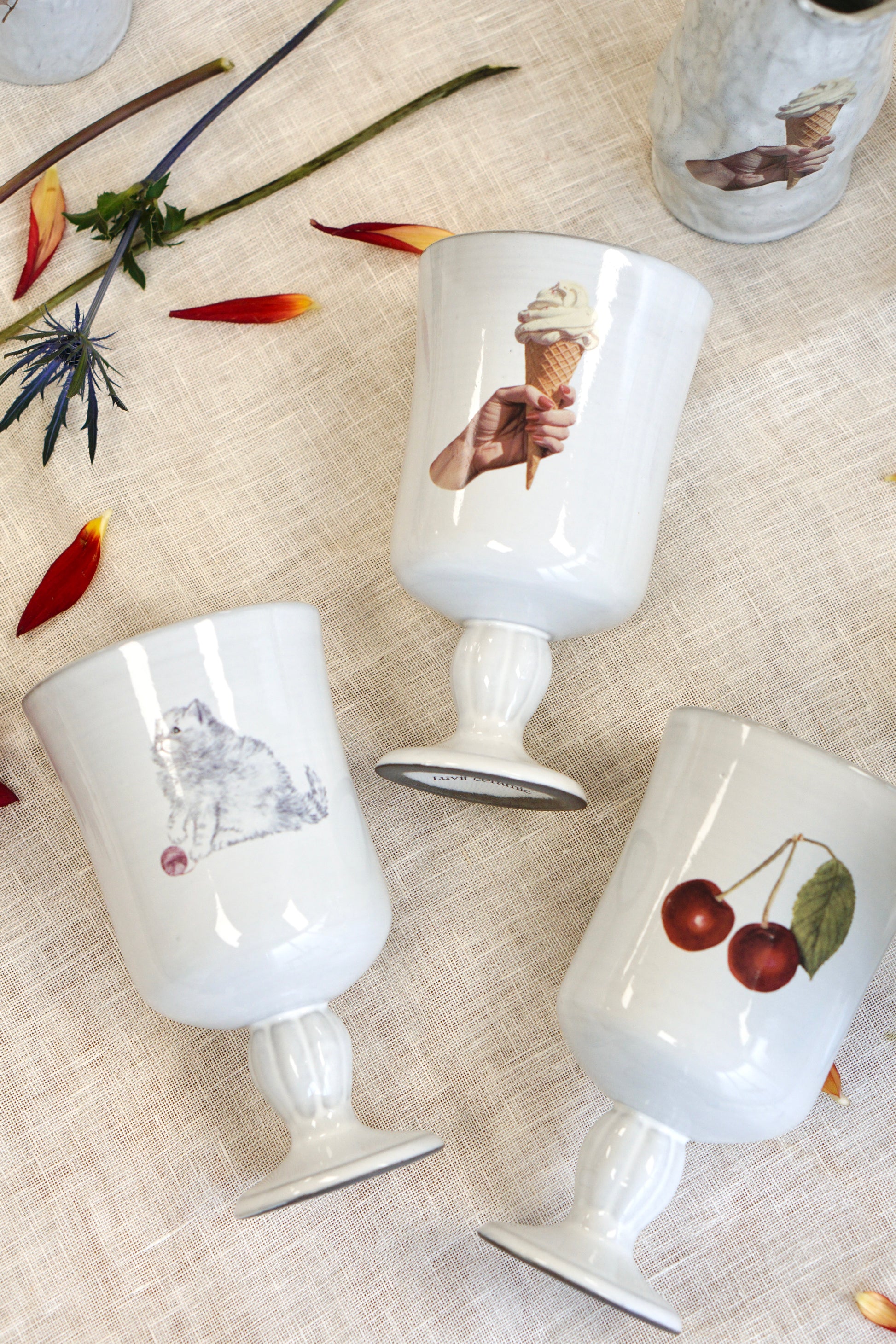 This tall wine goblet unlike any other— adorned with a whimsical mix of cherries, rabbits, ice cream, and roses. Delicate yet full of charm, it brings a playful elegance to your table or display. Perfect for sipping something sweet or serving up a little surprise at your next gathering.