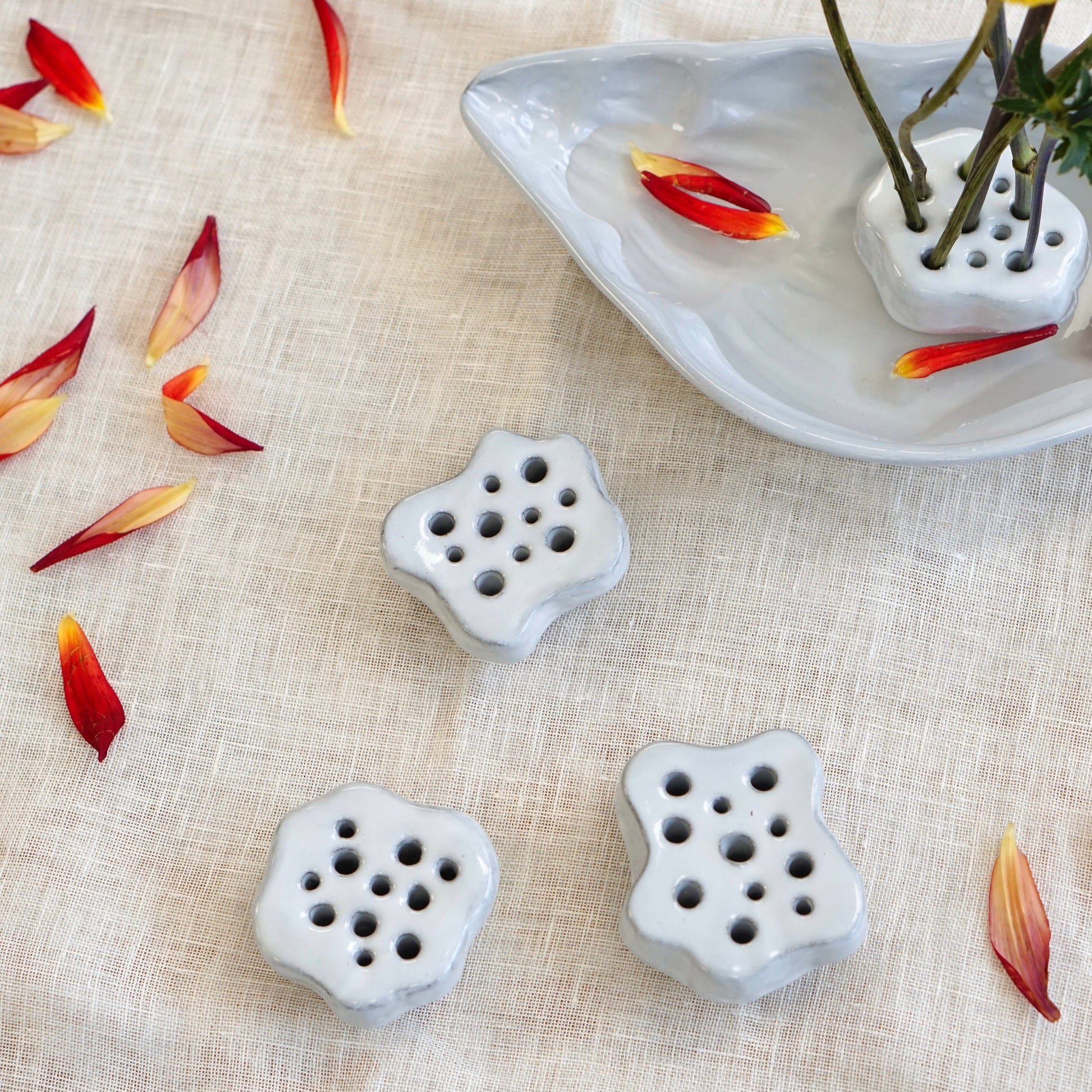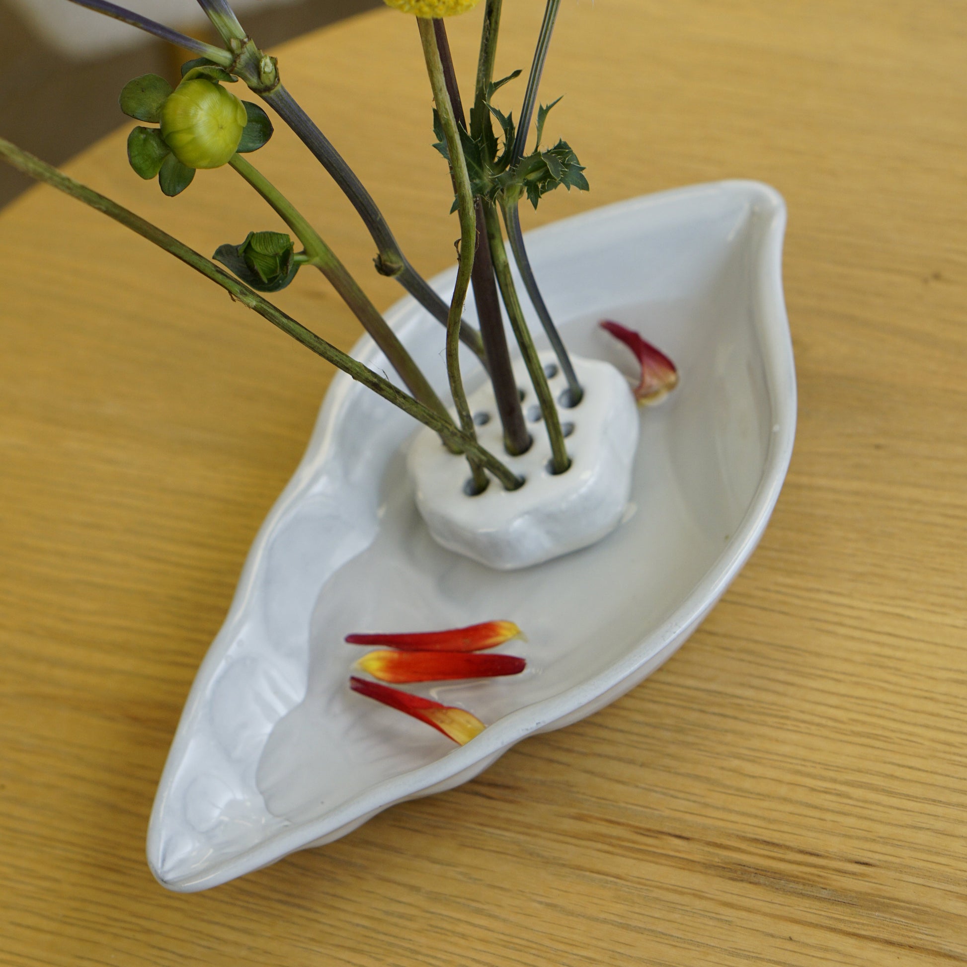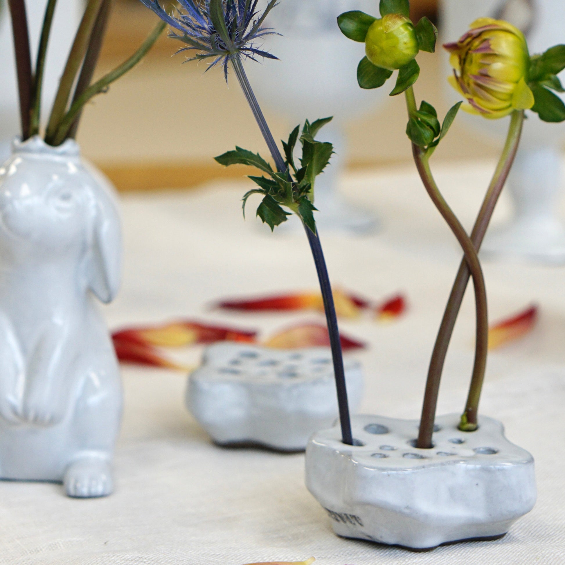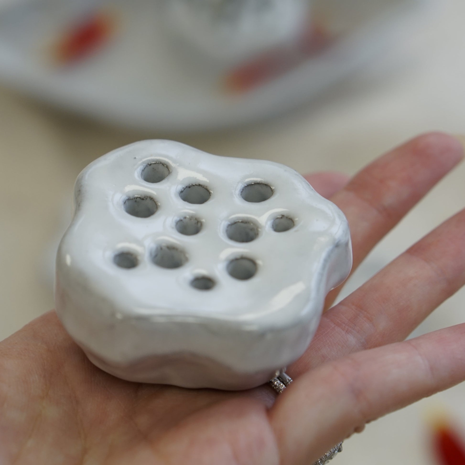 Crafted from rich black cotta clay and finished with a smooth white glaze, this lotus root-shaped flower stand is a true work of artisanal beauty. Each piece is handmade and uniquely shaped, celebrating the natural imperfections and individuality of handcrafted pottery. The distinctive pattern inspired by the lotus root adds both texture and elegance, making it a stunning display for your favorite blooms or a striking decorative accent in any room.