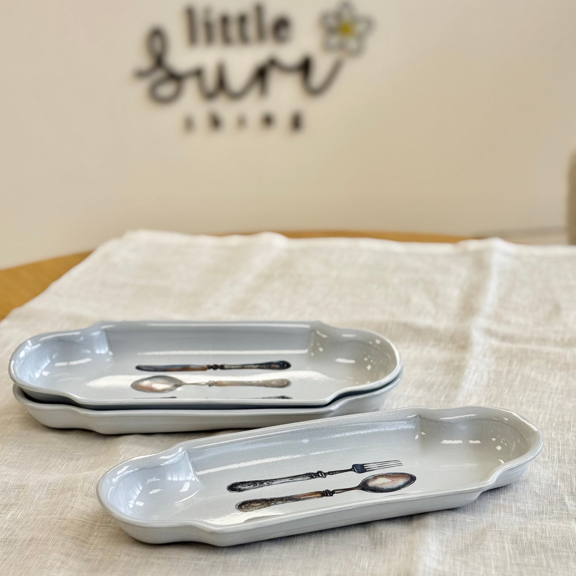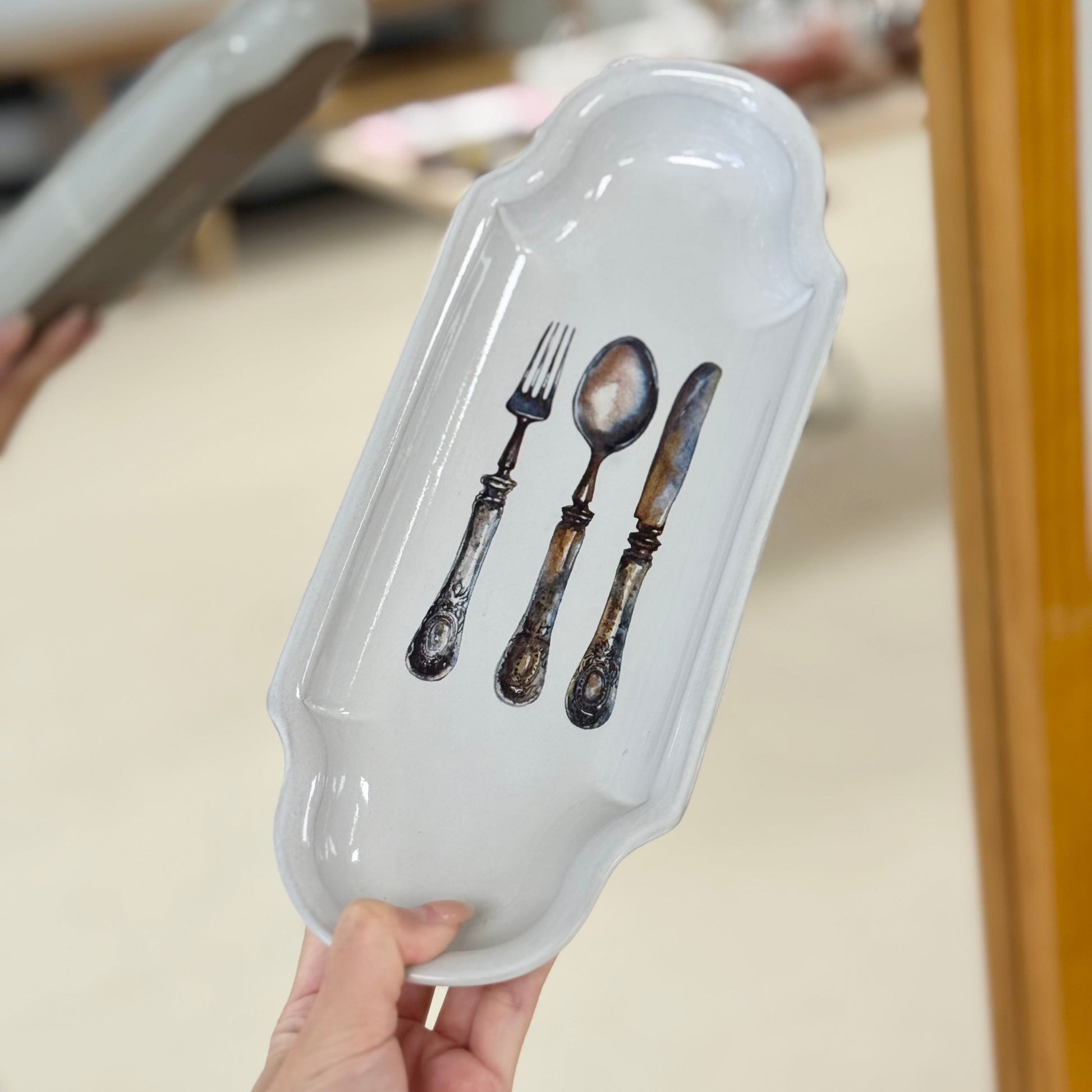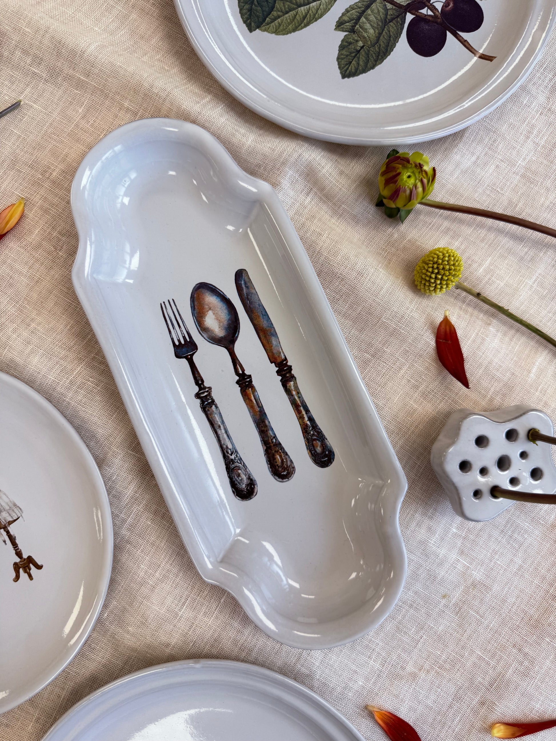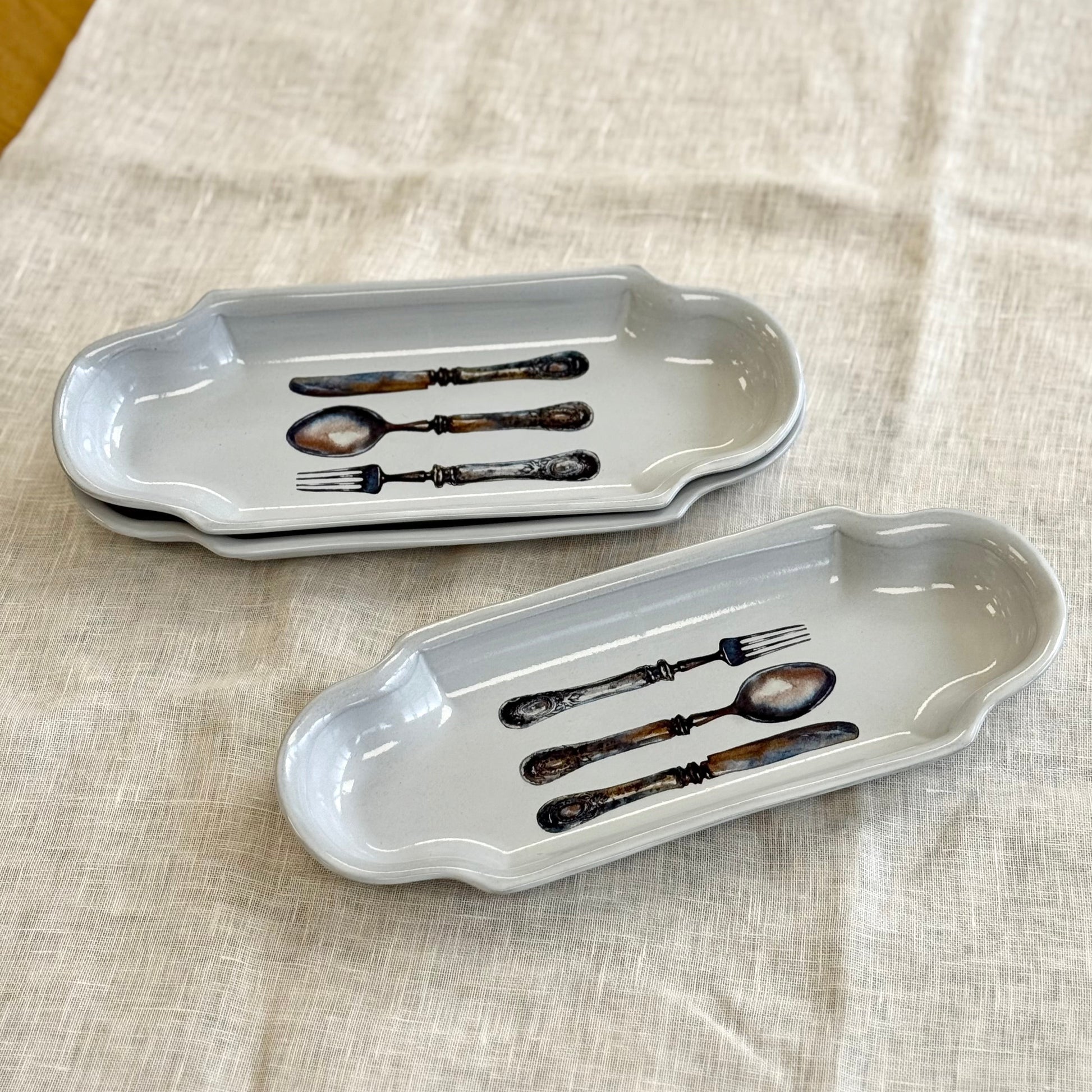 Bring a touch of vintage French charm to your table with the vintage service plate — a long, elegant serving piece adorned with a rustic cutlery set print. Crafted with timeless appeal, this plate evokes the rustic beauty of countryside kitchens and old-world bistros.